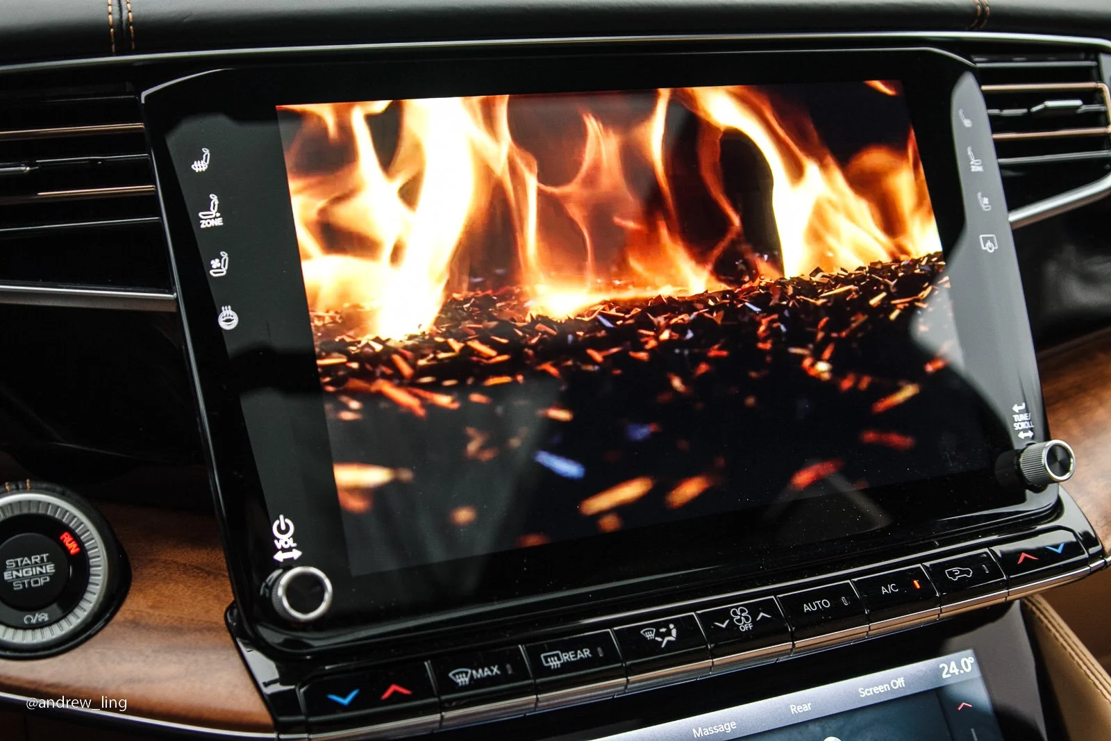 Unique to the Grand Wagoneer’s options list is a four-zone climate control system, 24-way power seats and a higher-end McIntosh audio system with additional speakers. The Grand Wagoneer also provides larger infotainment screens on the dash and in the back seat compared to its sister model, the Wagoneer. There is even a front passenger screen with novelty easter eggs such as a virtual fireplace or aquarium. But it also functions as a secondary infotainment system which can only be seen by the front passenger.