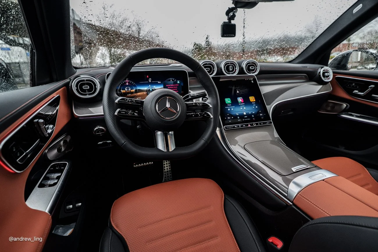 Step inside and the GLC350e reminds you that this is a true Mercedes. The cabin blends floating, turbine-style vents, a freestanding 12.3-inch digital instrument cluster, and a portrait-oriented 11.9-inch MBUX infotainment touchscreen that flows into the centre console.